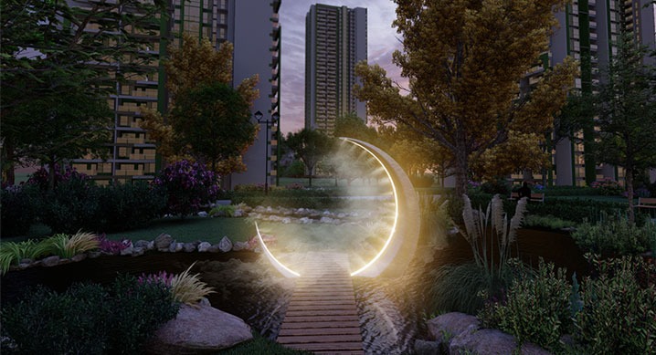 ‘미스트 랜드스케이프’는 환경정화식물들이 심어진 단지내 테마숲에 고압 포그(fog) 시스템을 적용해 초미세 물방울을 분사함으로써 유려한 경관을 제공할뿐만 아니라 미세먼지를 흡착해 제거하고 여름에는 주변 온도를 낮추는 효과도 있다.