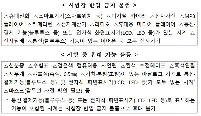 한편 시험장 반입 금지 물품 및 시험 중 휴대 가능 물품을 확인하고 숙지하는 것도 중요하다. 금지 물품을 실수로 소지하는 경우라도 부정행위 처리되므로 소지할 수 없는 물품과 소지할 수 있는 물품을 명확히 구분해야 한다.