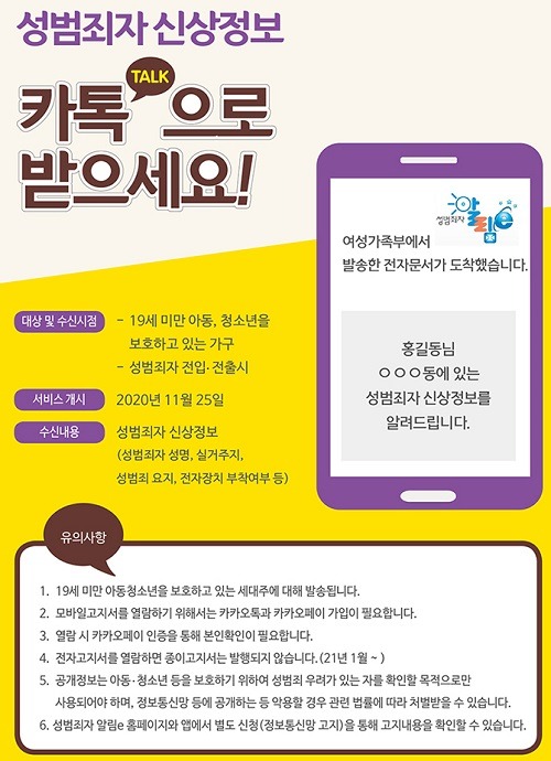 한편 성범죄자 신상정보 모바일고지서 수신과 열람을 원하는 19세 미만 아동·청소년 보호가구의 세대주는 카카오톡 및 카카오페이에 가입한 후 본인인증절차를 거치면 된다.