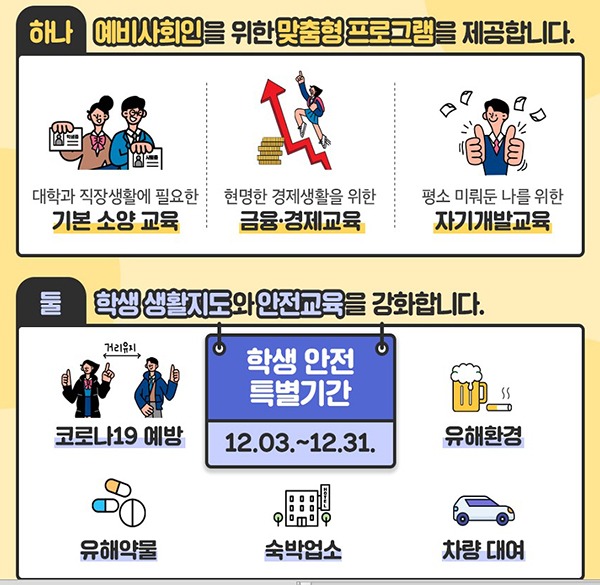학생 안전 특별기간은 12월 3일 수능일부터 같은 달 31일까지로, 많은 학생들이 이용할 것으로 예상되는 각종 시설을 대상으로 감염병 예방 등 안전관리와 지도·순찰을 강화한다.