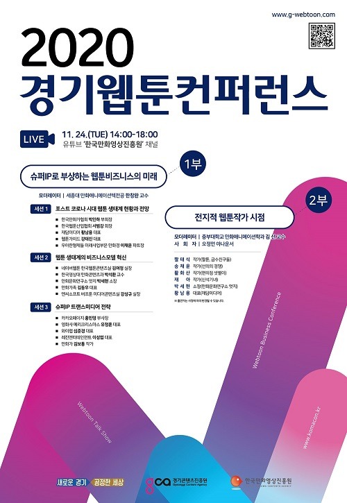 경기도가 주최하고 한국만화영상진흥원과 경기콘텐츠진흥원이 공동으로 주관하는 2020 경기웹툰컨퍼런스는 50여명의 사전신청자가 오프라인으로 현장에 참여하고 전 과정은 유튜브를 통해 생중계 된다.