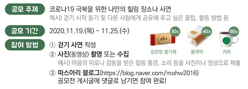 아울러 복지부는 19일부터 25일까지 마음의 안정을 찾았던 나만의 힐링 장소나 사연을 사진(또는 동영상)과 함께 공모하는 ‘마음 걷기’ 국민 참여 공모 이벤트도 진행한다고 밝혔다.