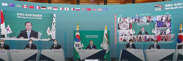 문 대통령은 이런 국제연대와 협력이 “세계 경제가 함께 일어설 발판을 마련한 것”이라고 평가한 뒤 “전 세계가 사상 최악의 ‘보건’, ‘경제’ 위기 파고를 함께 넘고 있다”고 진단했다.