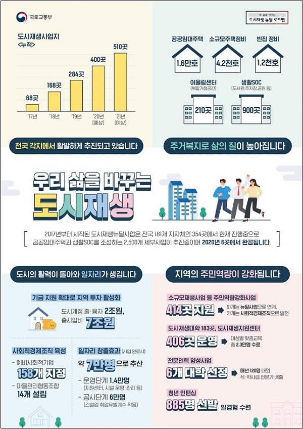 정부는 지난 2017년 68곳을 시작으로 매년 100여 곳의 도시재생뉴딜사업을 선정, 올해 11월 현재까지 181개 지자체에서 총 354곳의 사업이 전국 각지에서 활발하게 진행되고 있다.