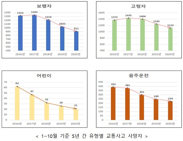 국토교통부와 경찰청은 25일 올해 10월말 기준 교통사고 사망자 수는 전년 동기(2019년 1~10월, 2739명)에 비해 5.5% 감소한 2587명으로 잠정 집계됐다며 이같이 밝혔다.
