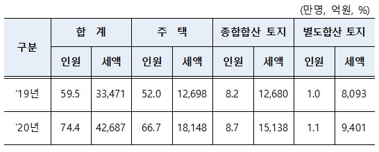 2020년 종합부동산세 고지대상자는 74만 4000명이며 고지세액은 4조 2687억원이다.