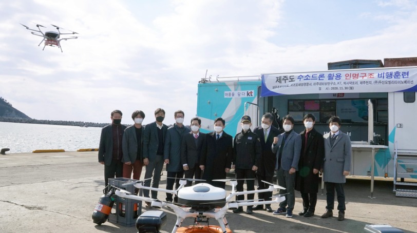 DMI는 30일, 제주 서귀포항 여객터미널에서 제주도, 서귀포해양경찰서, 아주대외상연구소, KT와 함께 수소드론을 활용한 해상 인명구조 비행훈련을 실시했다고 밝혔다. 이 자리에는 원희룡 제주도지사, 이국종 아주대 교수, 이두순 DMI 대표 등이 참석했다.