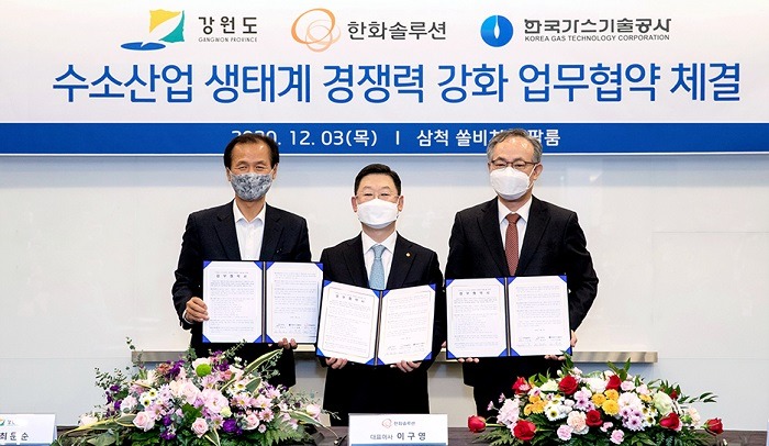 한화솔루션은 3일 강원도·한국가스기술공사와 '강원도 수소산업 생태계 경쟁력 강화'를 위한 업무협약(MOU)을 체결했다고 밝혔다. 이날 강원도 삼척시 쏠비치 리조트에서 열린 협약식에는 최문순 강원도지사, 고영태 한국가스기술공사 사장, 이구영 한화솔루션 케미칼 부문 대표가 참석했다.