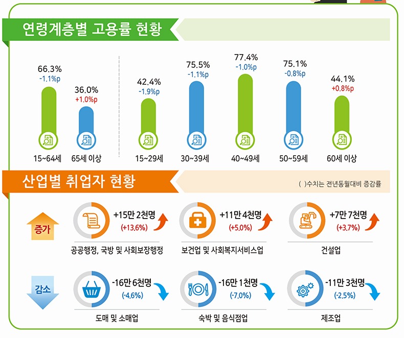 취업자의 경우 산업별로 살펴보면 공공행정 ·국방 및 사회보장행정, 보건업 및 사회복지서비스업, 건설업 등에서 증가했으나 도매 및 소매업, 숙박 및 음식점업, 제조업 등에서 각각 감소했다.