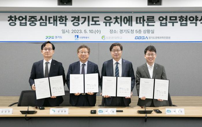 경기도가 중소벤처기업부 창업중심대학 공모사업에 선정된 가운데 사업의 효과적인 추진을 위해 수원시, 성균관대학교, 경기도경제과학진흥원과 힘을 모으기로 했다. 염태영 경기도 경제부지사와 황인국 수원시 제2부시장, 김경환 성균관대학교 창업지원단장,