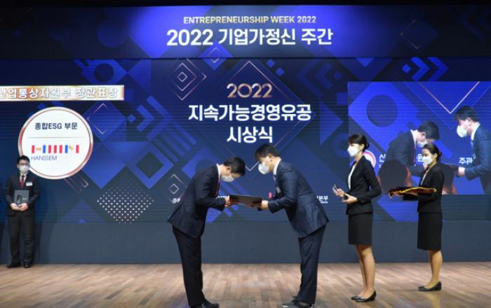 종합 홈 인테리어 전문기업 한샘(대표 김진태)이 서울 중구 대한상공회의소에서 개최된 ‘2022년 지속가능경영유공 정부포상’에서 산업통상자원부 장관 표창을 수상했다고 8일 밝혔다.◇ 한샘, ESG 경영 의지 인정받아 평가기준 상향에도 ‘A급’지속가능경영유공 정부포상은 산