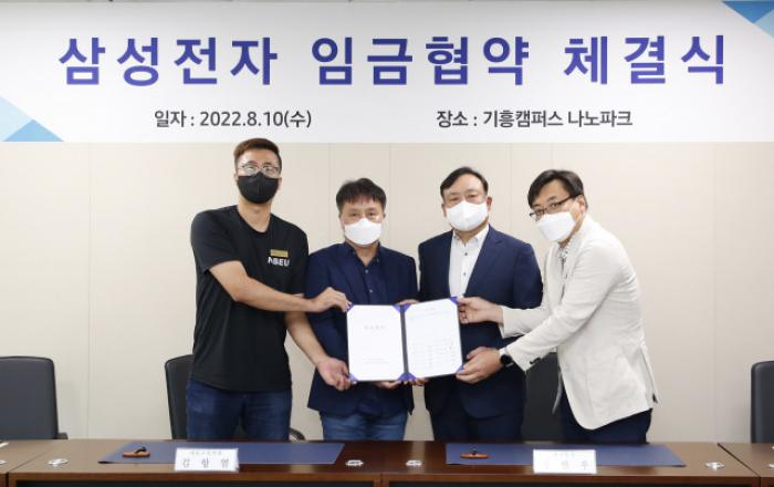 삼성전자는 노동조합 공동교섭단과 2021·2022년 임금 협약을 체결했다고 10일 밝혔다. 삼성전자와 노동조합 공동교섭단은 10일 기흥캠퍼스 나노파크에서 최완우 DS부문 인사팀장(부사장), 신인철 삼성전자 교섭대표(상무), 삼성전자노동조합 공동교섭단 김항열 위원장, 이