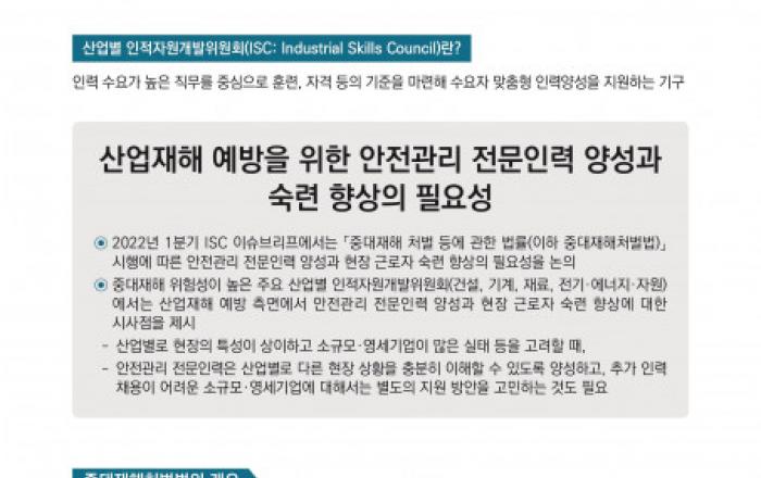 한국직업능력연구원은 2022년 1분기 산업별 인적자원개발위원회(ISC: Industrial Skills Council) 이슈브리프 ‘산업재해 예방을 위한 안전관리 전문인력 양성과 숙련 향상의 필요성’을 발간했다. ISC 이슈브리프는 18개 산업별 인적자원개발위원회
