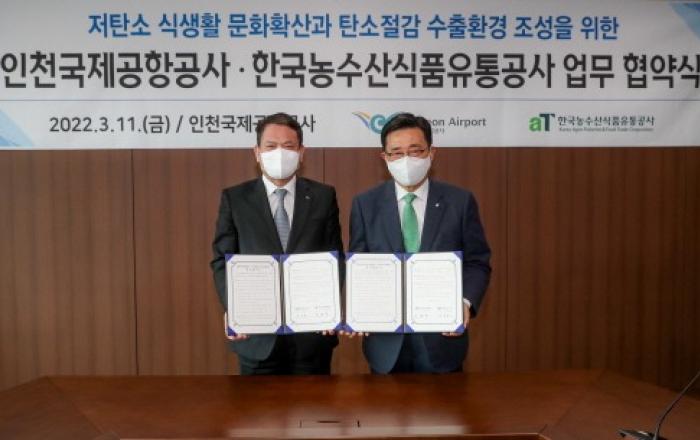 인천국제공항공사는 11일 오전 공항공사 회의실에서 한국농수산식품유통공사와 'ESG 실천과 저탄소 식생활 문화 확산을 위한 인천국제공항공사-한국농수산식품유통공사(aT) 업무 협약식'을 개최했다고 밝혔다.이번 협약식은 인천공항공사 김경욱 사장을 비롯해 한국농수산식품유통공사