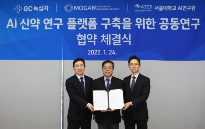 GC녹십자는 목암생명과학연구소(이하 목암연구소)와 함께 서울대학교 AI 연구원과 경기도 용인에 있는 목암타운에서 AI 신약 연구 플랫폼 구축을 위한 공동연구 협약을 체결했다고 25일 밝혔다.이날 협약식은 허은철 GC녹십자 대표 및 정재욱 목암연구소장, 장병탁 서울대 A