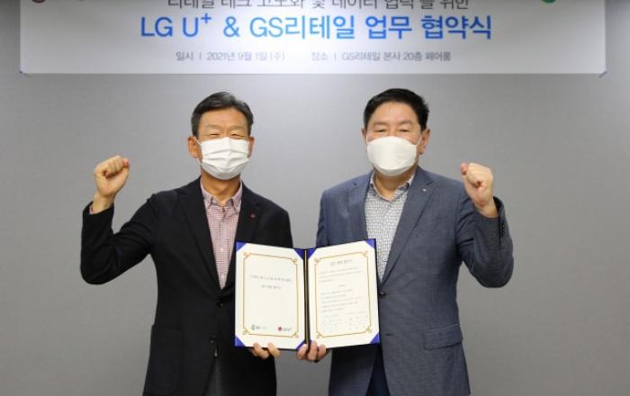 GS리테일과 LG유플러스가 역삼동 소재의 GS리테일 본사 경영회의실에서 허연수 GS리테일 대표이사, 황현식 LG유플러스 대표이사 등이 참석한 가운데 첨단 리테일테크(소매 유통 사업에 정보통신 기술의 접목한 것) 구축 등을 위한 업무 협약을 체결했다고 2일 밝혔다.▲ 왼