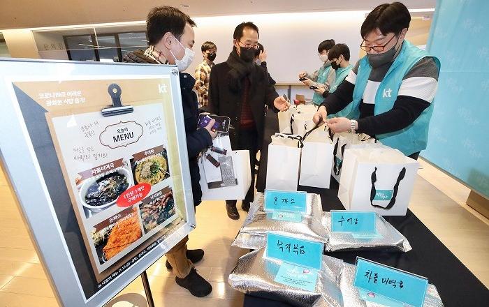 KT가 연초부터 코로나19로 매출이 급감한 식당을 돕기 위해 팔을 걷어붙였다. KT(대표 구현모, www.kt.com)는 19일 광화문 인근 식당에서 만든 밀키트(Meal Kit, 간편조리식)를 KT 광화문 사옥에서 판매한다고 밝혔다. 사회적 거리두기 2.5단계 장기