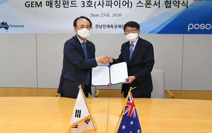 포스코가 호주 철광석 공급사 에프엠지(FMG)와 함께 GEM 매칭펀드 3호를 조성하며 지역 인재 육성을 지원한다.포스코는 25일 대치동 포스코센터에서 유병옥 포스코 구매투자본부장, 임만규 전남인재육성재단 사무국장이 참석한 가운데 스폰서 협약을 체결했다. 코로나19의