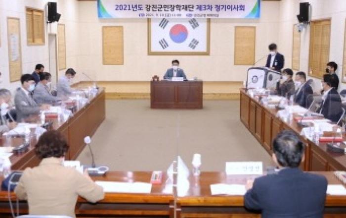 강진군민장학재단은 지난 10일 강진군청 대회의실에서 재단 임원들이 참석한 가운데 2021년 제3차 정기이사회를 개최했다.이날 이사회에서는 손 소독, 발열체크 등 방역수칙을 철저히 준수한 가운데 ▲2021년 하반기 강진군민장학재단 장학생 선발(안) ▲명문대 분야 및 전문