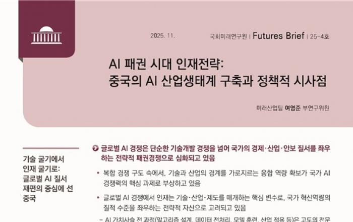 국회미래연구원(원장 김기식)은 11월 11일(화)에 “AI 패권 시대 인재전략: 중국의 AI 산업생태계 구축과 정책적 시사점” 브리프를 발간했다. 브리프는 글로벌 AI 기술 경쟁이 국가 차원의 경제·산업·안보 질서를 좌우하는 ‘전략적 패권경쟁’으로 확산되는 가운데, 중