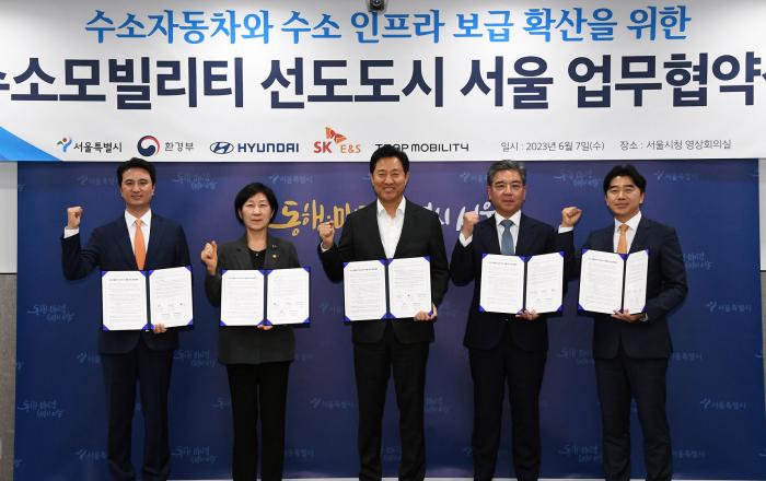 현대자동차는 7일 서울시청에서 서울시, 환경부, SK E&S, 티맵모빌리티와 함께 서울시의 시내버스와 공항버스, 통근버스 등을 수소버스로 전환하기 위한 ‘수소 모빌리티 선도도시 서울 조성 업무협약(MOU)’을 체결했다. 이날 행사에는 장재