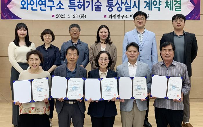 충북농업기술원은 와인연구소에서 개발한 홍시 주정강화 와인, 무알코올 와인 음료 등 4개 특허기술에 대하여 6개 업체에 총 7건의 통상실시 계약을 23일(화) 체결했다고 밝혔다. 이날 계약된 특허기술 중 와인코리아(주)농업회사법인(대표 윤태림) 과 필(대표 최성숙)에