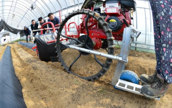 충청북도농업기술원은 비닐 멀칭 작업 시 농업인이 지속적으로 걸어 다녀야 하는 힘든 상황을 해결하기 위해 '비닐 피복 관리기 탈부착용 접이식 발판 구조물'을 개발해 특허 출원했다고 밝혔다. 해마다 농사가 시작될 때면 옥수수 등 밭작물 정식을 위해 두둑(이랑)을 만들고