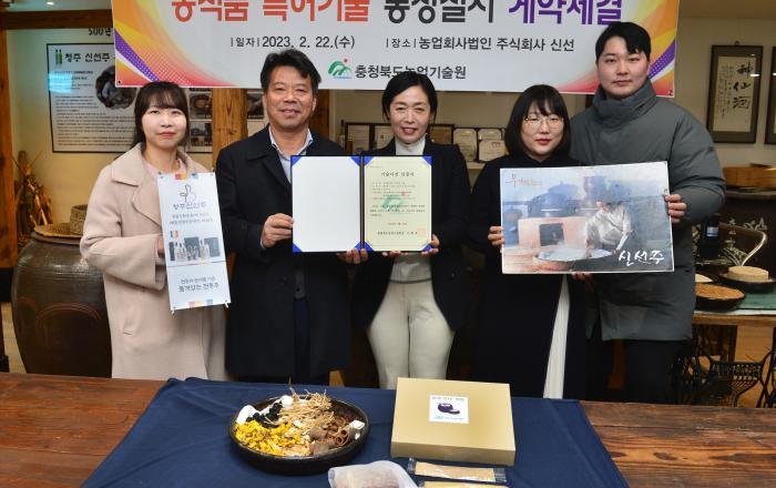 충북농업기술원은 22일 주박과 한약재로 만드는 모주 체험키트 제조에 관한 특허기술을 농업회사법인 ㈜신선(대표 박준미)과 기술이전 계약을 체결했다. 이날 계약한 특허 기술은 술을 거르고 남은 주박(酒粕)을 열풍건조하고 한약재로 감초, 계피, 대추 등과 혼합해 최적의