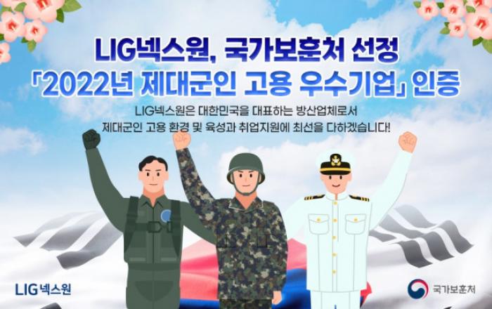LIG넥스원이 국가보훈처로부터 ‘제대군인 고용 우수기업’ 인증을 받았다.‘제대군인 고용 우수기업 인증제’는 중·장기복무 제대군인 고용 및 인재육성에 대한 기업의 관심과 자발적 참여를 유도하기 위해 국가보훈처가 2015년도에 도입해 추진하는 사업이다. 국가보훈처는 제대군