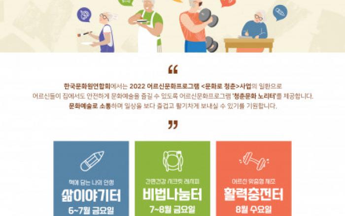 문화체육관광부(이하 문체부)와 한국문화원연합회(이하 연합회)가 60세 이상 어르신을 대상으로 6월부터 8월까지 2022 어르신 비대면 문화예술프로그램 ‘청춘문화 노리터(老利攄)’(이하 ‘청춘문화 노리터’)를 추진한다. ‘청춘문화 노리터’는 어르신들이 안전한 공간에