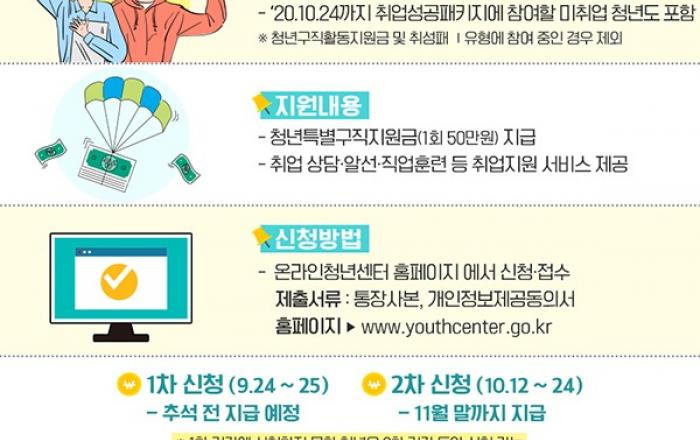 적극적 구직의사를 가진 저소득·미취업 청년을 대상으로 1인당 50만원을 지급하는 ‘청년특별구직지원금’ 2차 신청이 12일부터 시작된다. 고용노동부는 청년특별구직지원금 신청은 1차와 2차로 나누어서 진행하는데, 지난 9월 1차 신청 접수 결과 총 4만 3866명이 신청했