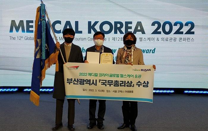 부산시는 지난 10일 열린 보건복지부 주관 ‘2022 메디컬 코리아 글로벌 헬스케어 유공 시상식’에서 국무총리 표창을 받았다고 밝혔다. 글로벌 헬스케어 유공 시상은 올해 메디컬 코리아 행사와 연계하여 진행됐고, 매년 보건복지부에서 외국인 환자 유치사업의 추진 활동