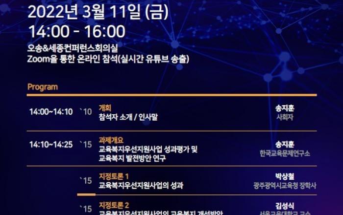 교육복지의 대표정책인 ‘교육복지우선지원사업’의 과거와 현재를 논의하고, 코로나19 이후 모든 학생의 성장을 위한 교육복지 발전방안에 대해 모색하는 장이 마련된다.교육부는 11일 오송&세종컨퍼런스회의실에서 한양대학교 한국교육문제연구소와 공동으로 제3차 ‘교육정책 열린 대