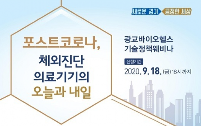 경기도는 경기도경제과학진흥원 바이오센터와 함께 코로나19와 같은 감염병 진단에 중요시 되고 있는 체외진단의료기기에 대한 비대면 세미나를 개최한다. 이번 세미나는 2020년 경기도 의료기기산업 육성지원 사업 내 ‘경기 첨단의료기기 협의체(G-MediCluster) 운영