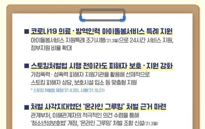 여성가족부가 코로나 19 의료‧방역인력에 대한 ‘긴급돌봄 지원’, 스토킹 피해자에 대한 ‘선제적 보호‧지원’ 등 현장 맞춤형 ‘적극행정’으로 국민들의 정책 체감도를 높이고 있다. 김경선 여성가족부 차관은 10월 14일(목) 개최된 ‘적극행정 이어가기 발표(제40차 차관