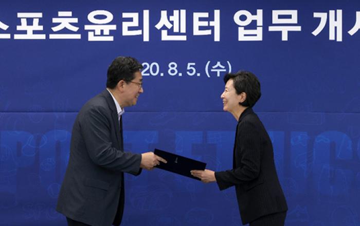 체육인의 인권보호 및 스포츠 비리 근절을 위한 전담기구인 ‘스포츠윤리센터’가 5일 업무를 개시했다. 문화체육관광부는 스포츠윤리센터가 설립 허가를 마치고 본격 출범했다고 밝혔다.▲ 스포츠윤리센터에서 박양우 문화체육관광부 장관이 이숙진 초대 이사장에게 임명장을 주고 있다