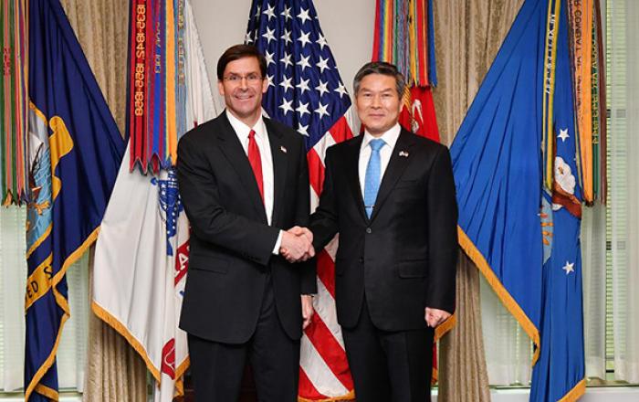 한·미 국방부 장관이 6·25전쟁 70주년을 맞아 한반도의 항구적인 평화와 번영을 보장하기 위한 연합방위태세 유지 공약을 재확인하며 한미동맹을 강화해 나가기로 합의했다.▲ 악수하는 한미 국방장관 국방부에 따르면 정경두 장관과 마크 에스퍼 미 국방부 장관은 25일 6·