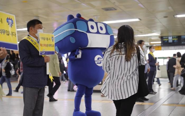 서울교통공사는 코로나19 감염으로부터 안전한 지하철을 만들기 위해 5월 29일, 6월 1일, 3일 사흘간에 걸쳐 지하철에서 마스크 착용을 권고하는 캠페인을 벌인다.▲ 2호선 건대입구역 대합실에서 직원들이 마스크 착용 캠페인을 벌이고 있다이번 캠페인은 오전 8시부터 9시