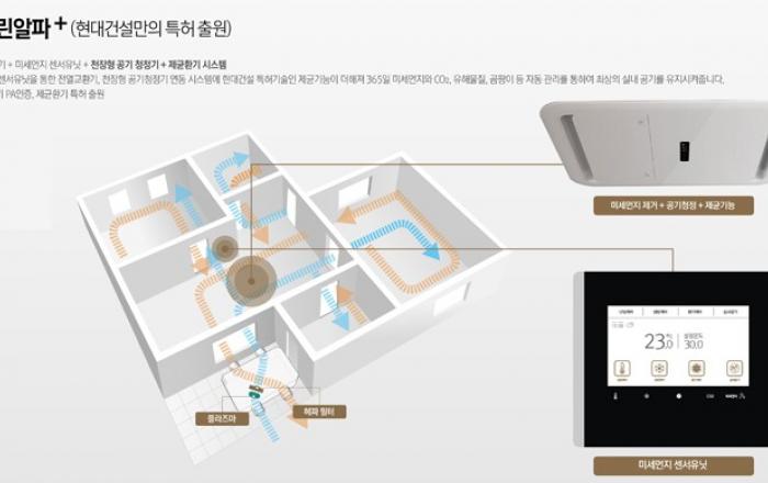 현대건설이 세계최초 공기청정 세대환기 시스템 개발을 완료, 미세먼지 저감을 위한 토탈 솔루션 ‘H 클린알파 플러스(Clean α+)’를 완성해 소비자들에게 선보인다.현대건설만의 독자적인 특허 기술인 공기청정 세대환기 시스템은 미세먼지 저감은 물론 헤파 필터로도 제거할
