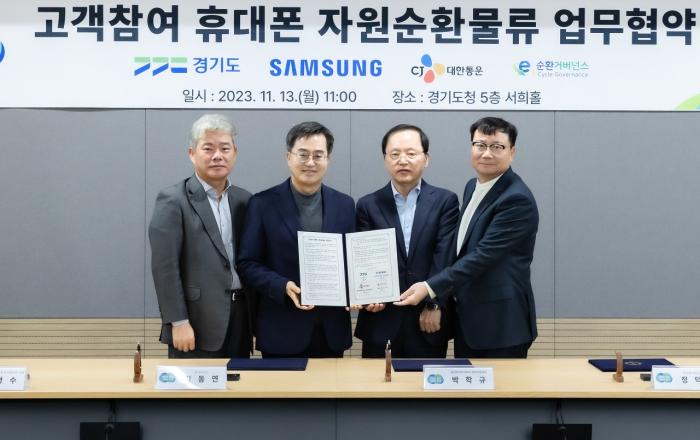 사용하지 않는 휴대폰을 수거해 이를 파쇄·분리해 재활용하고 기부자에게는 기부영수증이나 탄소중립포인트 등을 제공하는 자원순환 프로그램이 내년 2월경 시작될 예정이다. 김동연 경기도지사는 13일 경기도청에서 박학규 삼성전자㈜ 경영지원실장, 신영