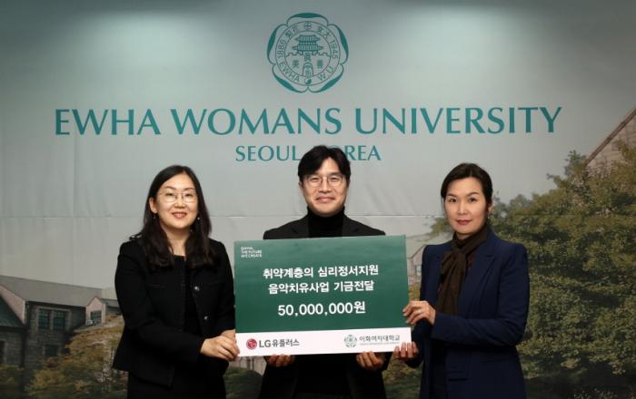 LG유플러스는 이화여자대학교와 함께 취약계층 아동과 청소년을 대상으로 음악치료 프로그램을 지원한다고 12일 밝혔다. LG유플러스는 이화여자대학교 음악치료학과에 지원금 5000만원을 전달하고 악기 연주와 가창, 창작 중심의 음악활동을 통한 심리정서 지원 프