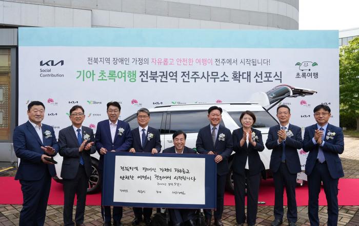 기아가 교통약자 이동권 향상을 위한 사회공헌 사업 ‘초록여행’을 통해 전라북도 지역 내 장애인들이 안전하고 편리한 여행을 즐길 수 있도록 돕는다. 기아는 5일(화) 한국전통문화전당(전북 전주시 소재) 야외마당에서 정의철 기아 기업전략실 전