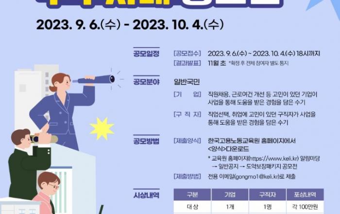 고용노동부는 9월 6일(수)부터 10월 4일(수)까지 한국고용노동교육원과 함께 '도약보장 패키지 수기 공모전'을 개최한다. 도약보장 패키지는 구직·구인에 어려움이 있는 구직자와 기업을 대상으로 '진단-컨설팅-취업·채용지원' 등 1:1 맞춤형 종합서비스를 제공하는 사