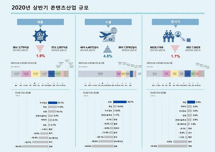 2020년 상반기 국내 콘텐츠산업 매출액은 전년 동기 대비 -1.9% 감소한 57조 3천억 원으로 집계됐다. ▲지식정보(12.1%) ▲게임(11.9%) ▲만화(10.1%) 등 비대면 소비가 가능한 장르들은 높은 성장률을 기록했으며, ▲영화(-54.2%) ▲광고(-18.7%) ▲애니(-10.4%) ▲음악(-9.0%) 등 대면 소비 비중이 크거나 경기변동과 직결된 장르들은 큰 폭으로 감소했다.
