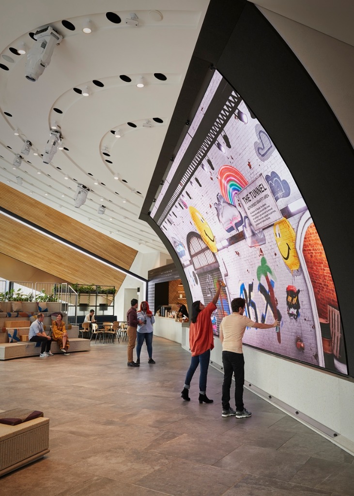 '삼성 킹스크로스' 한쪽 벽면을 가득 채운 가로 10.08m, 세로 4.32m의 초대형 커브드 LED 스크린 '스크린 맥스(Screen Max)'는 건축 디자이너 토마스 헤더윅의 제안에 따라 쇼핑몰 디자인과 잘 어울리도록 힘찬 파도를 형상화하는 디자인이 반영됐다.