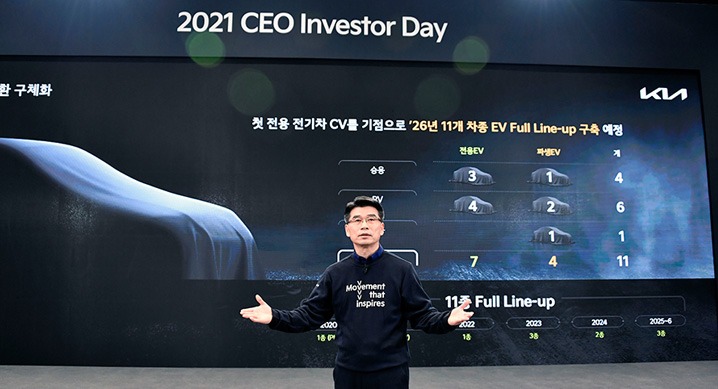 지난해까지 기아는 내연 기관 차종 기반의 파생 전기차만을 출시해 왔지만 올해 출시되는 전용 전기차 CV를 시작으로 전용 전기차 라인업을 강화한다. 전동화 전환 가속화를 위해 기존 계획보다 1년 앞당겨 오는 2026년까지 전용 전기차 7개를 출시해, 파생 전기차 4종과 함께 총 11개의 전기차 풀 라인업을 구축할 계획이다.
