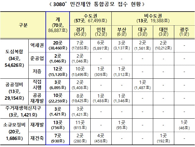 그 결과 경기와 인천을 비롯한 6개 광역 시도에 걸쳐 총 70곳, 8만 7000가구 규모가 접수됐다.