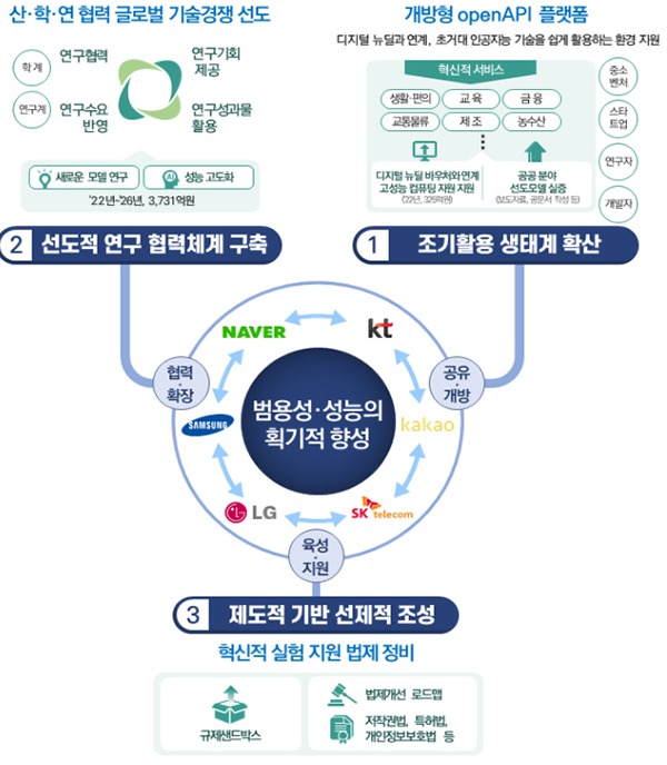 아울러 기업은 연구개발 사업 기획 및 참여를 통해 초거대 인공지능 연구개발 수요를 반영하고, 학계·연구계의 연구개발 성과물을 바탕으로 기업이 보유한 대규모 데이터 및 컴퓨팅 자원을 활용하여 새로운 초거대 인공지능으로 확장을 추진한다.