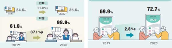 지난해 기준 학생의 온라인교육 이용률은 98.9%로 전년대비 37.1%p 높아져 코로나19 이후 비대면의 일상화에 따른 온라인 교육의 활용도가 사회 전반에 걸쳐 빠르게 증가하고 있다.