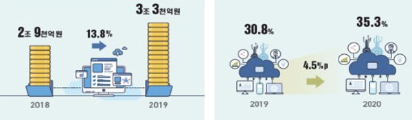 이 중 디지털 경쟁력의 마중물인 클라우드 산업 매출액은 2019년 3조 3000억원으로 전년 대비 13.8% 성장했고, 개인의 클라우드 이용률은 2019년 30.8%에서 지난해 35.3%로 4.5%p 증가해 클라우드 활용이 보다 범용화되고 있음을 보여주고 있다.